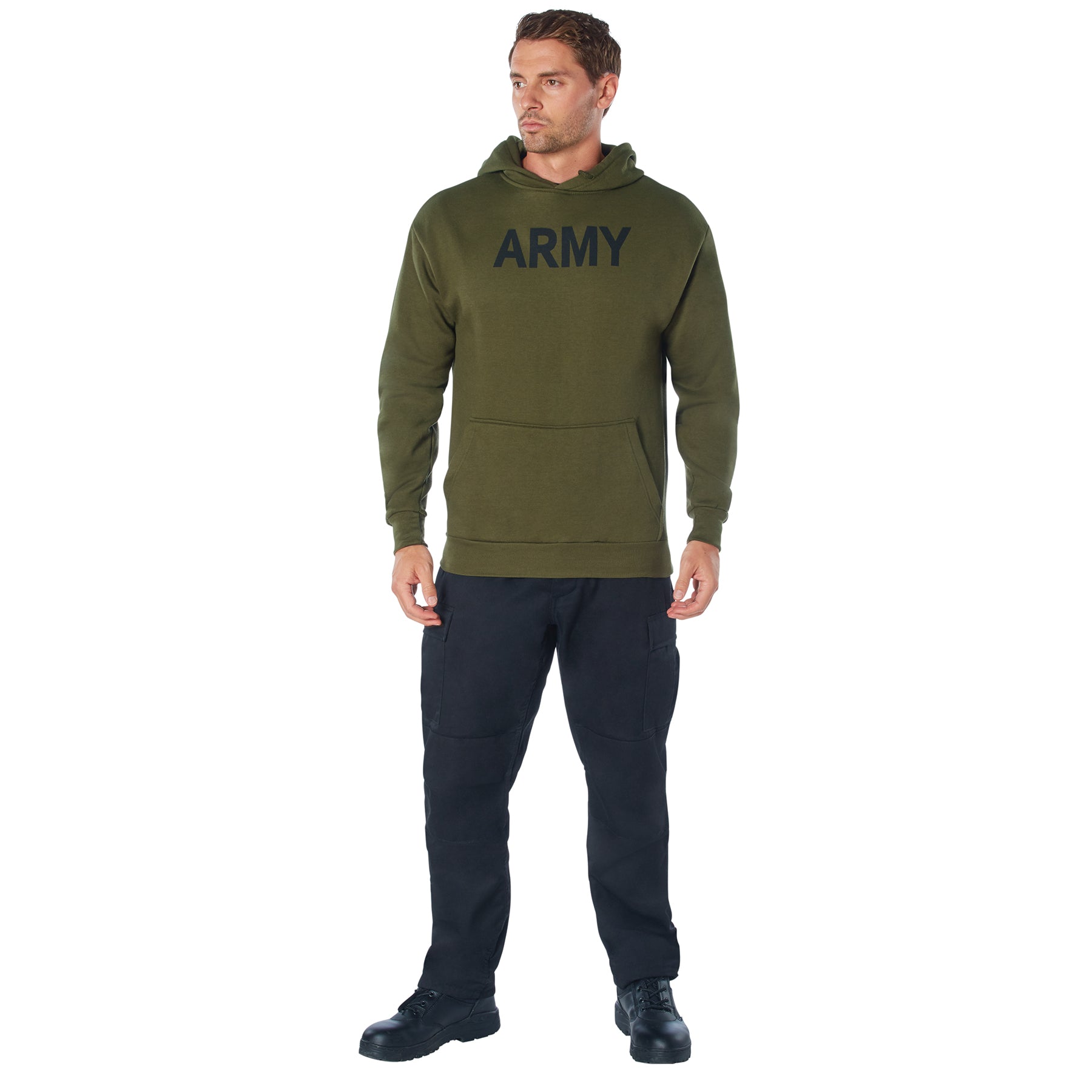 Get ready for an intense workout with Rothco's ARMY PT Pullover Hooded Sweatshirt. Featuring bold ARMY print, pair it effortlessly with Rothco’s Physical Training Sweatpants for a complete ensemble. Crafted from a soft yet durable poly-cotton blend, this sweatshirt offers optimal comfort and performance for athletic wear. The hoodie’s fleece lining ensures warmth during tough workouts and outdoor activities. With a convenient front pouch pocket, it provides easy storage for essentials on the move. Designed with a drawstring hood and elastic wrist cuffs, it offers a snug fit and added protection against the cold. Whether you're hitting the gym or braving the elements, this hoodie is your reliable companion for any physical training regimen.