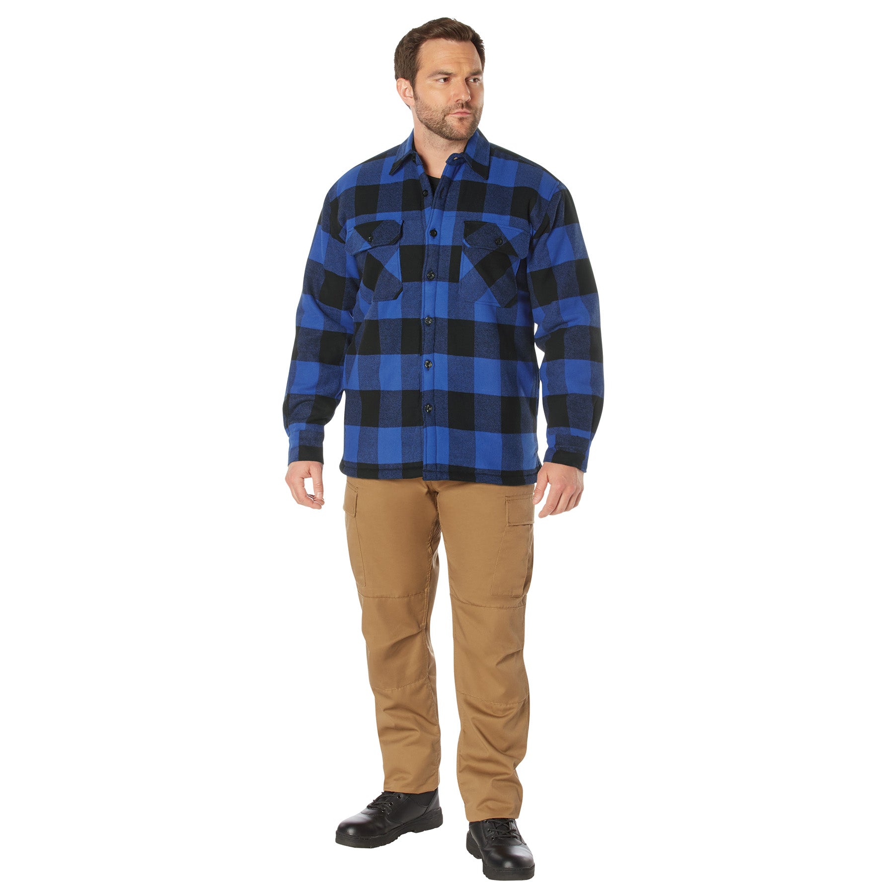 Brave the cold with Rothco’s Extra Heavyweight Buffalo Plaid Sherpa Lined Shirt, a rugged fusion of warmth and durability. Crafted from thick 100% cotton flannel and lined with soft sherpa fleece, this heavyweight work shirt doubles as an insulated overshirt built for the outdoors. Whether you're on the job, at the campsite, or off the grid, this cold-weather essential delivers dependable comfort, classic buffalo check style, and tough-as-nails performance. Sherpa-Lined for Peak Warmth: Lined through the body with thick sherpa lining, this insulated plaid overshirt traps heat and holds it in. The sherpa-lined shirt is built to keep you warm through frosty mornings, long shifts outdoors, and late nights by the fire. Cold-Weather Durability Meets Function: Featuring a reinforced button front, wrist cuffs, and dual chest pockets with secure flaps, this heavyweight outdoor shirt combines utility and style. The rugged cotton shell withstands outdoor use while offering easy access to everyday carry items. Designed for Dirt, Cold, and Grit: Crafted from 100% heavyweight cotton, this durable plaid work shirt stands up to the demands of harsh weather and daily wear. From hauling gear to clearing brush, the shacket is a cold-weather essential for any job site or backwoods mission. Built for the Outdoors: Whether you're stacking firewood, hitting the trail, or kicking back at camp, this buffalo check shirt jacket delivers serious warmth and lasting comfort. Wear it solo or throw it over your base layer, either way, it’s your go-to gear for unpredictable weather and tough terrain. Iconic Style with Real Utility: The bold buffalo plaid pattern is more than just classic, it's a staple of rugged American outerwear. Available in multiple colors, these insulated overshirts make the perfect gift for any outdoorsman, adventurer, or hard-working weekend warrior.