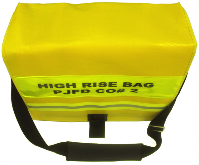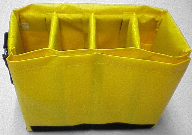 Padded, Divided, Tool Bag with full front cover, reflective TripleTrim, additional 2-section pocket under flap. Includes custom title, detachable shoulder strap. Four padded internal compartments, and hard bottom protect tools and equipment inside bag. Made of 18oz vinyl with Velcro closure.