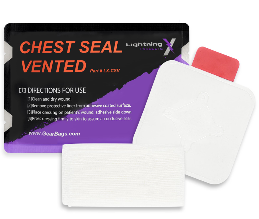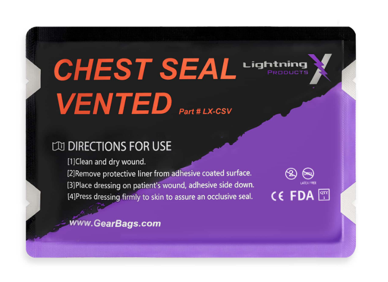 The Lightning X Vented Chest Seal is an occlusive dressing designed to treat open chest wounds. Injuries to the chest that result in open chest wounds may lead to tension pneumothorax, the second leading cause of preventable death on the battlefield. Our chest Seal is made with a medical grade hydrogel adhesive strong enough to adhere to skin that is exposed to blood, sweat, hair, sand or water. With the entire package measuring only 6″ x 4″, it’s configured to fit in IFAKs and small personal trauma kits.