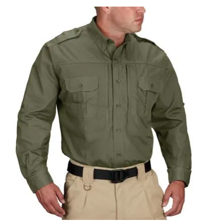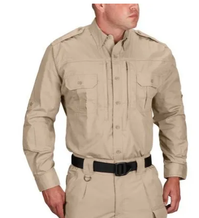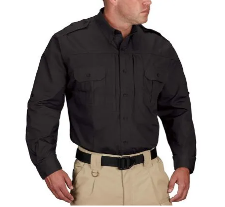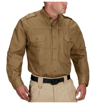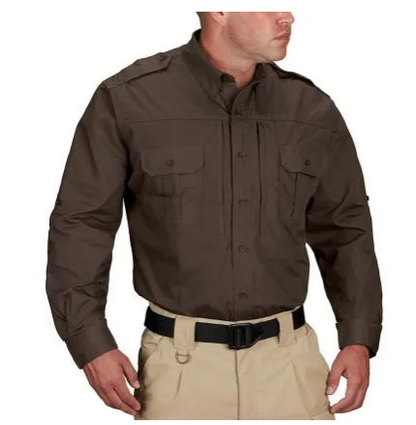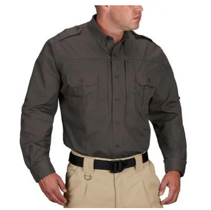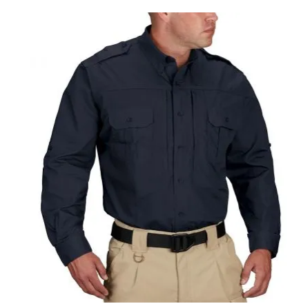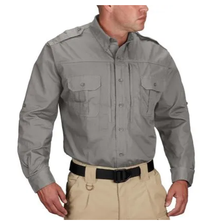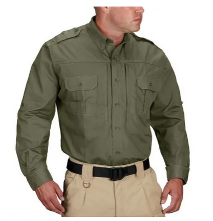 The PROPPER Tactical Shirt is comfortable, durable and professional whether on or off duty. The lightweight, breathable ripstop fabric is fade, shrink and wrinkle resistant, and treated with DuPont™ Teflon® fabric protector to repel stains and liquids. A mock button-up front conceals a hidden zipper for quick access to a vest or weapon. Also features a longer tail in back, two zippered chest pockets, roll-up sleeve tabs and gusseted underarms for a wider range of motion. Pair with our PROPPER tactical pant to create a uniform.
